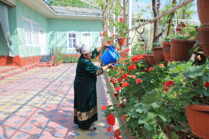 Особого внимания заслуживает эффективное использование приусадебных участков. Так, дом Шукуржона Косимова по праву можно назвать настоящим цветочным уголком: здесь выращивается более 350 редких растений 30 видов, размещенных в специальных контейнерах. Хозяйка дома Кумринисо-опа стала настоящим специалистом в цветоводстве и делится своим опытом с соседями.