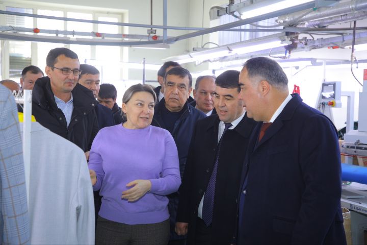 Затем гости также посетили еще одно крупное предприятие в Давлатабадском районе – «Ифтихор кийим саноат». Здесь выпускаются костюмы, пиджаки, джинсы и мужские рубашки. Ежегодно производится 60 тыс. единиц продукции. В предприятие было инвестировано 76 млрд. сумов, оно экспортирует продукции на 8 млн. долларов, прибыль – 4,5 млрд. сумов. Здесь работают 450 человек.