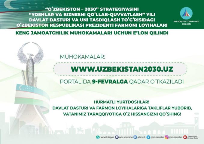 Центр «Стратегия развития» сообщает, что проект Указа Президента Республики Узбекистан о реализации стратегии «Узбекистан-2030» в «Год поддержки молодежи и бизнеса» вынесен на общественное обсуждение.