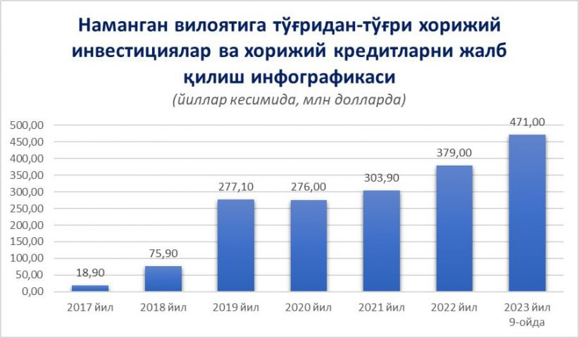 В 12 из 14 районов области выполнен план освоения прямых иностранных инвестиций и кредитов на январь-сентябрь 2023 года. Большая часть прямых иностранных инвестиций и кредитов пришлась на Давлатабадский район (20 %), Чустский район (17 %), город Наманган (15 %) и Туракурганский район (11 %).