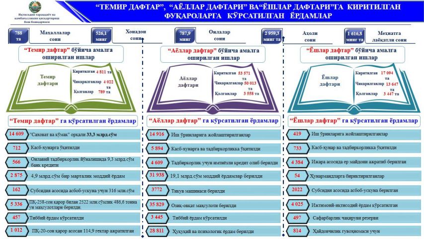 Из этих средств 1,9 млрд. сумов выделено 99 молодым людям, включенным в «молодежную тетрадь», и 1,3 млрд. сумов – 88 женщинам, внесенным в «женскую тетрадь», или всего – 3,2 млрд. сумов.