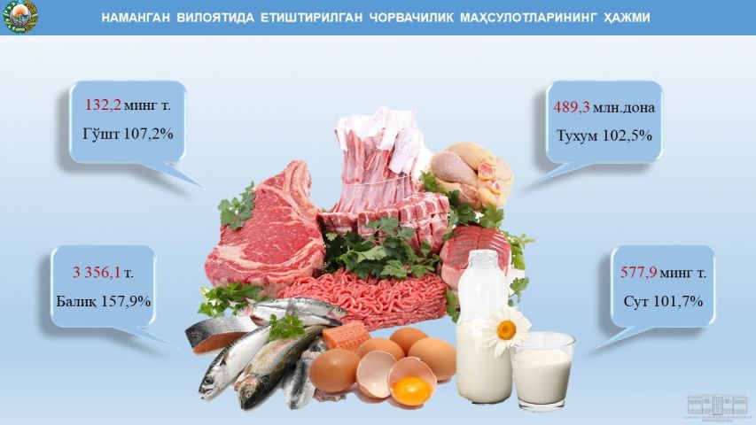 Общий объем продукции животноводства, выращенной хозяйствами Наманганской области за январь-сентябрь 2022 года, составил 8 063,4 млрд сумов, или 103 % к соответствующему периоду 2021 года.
