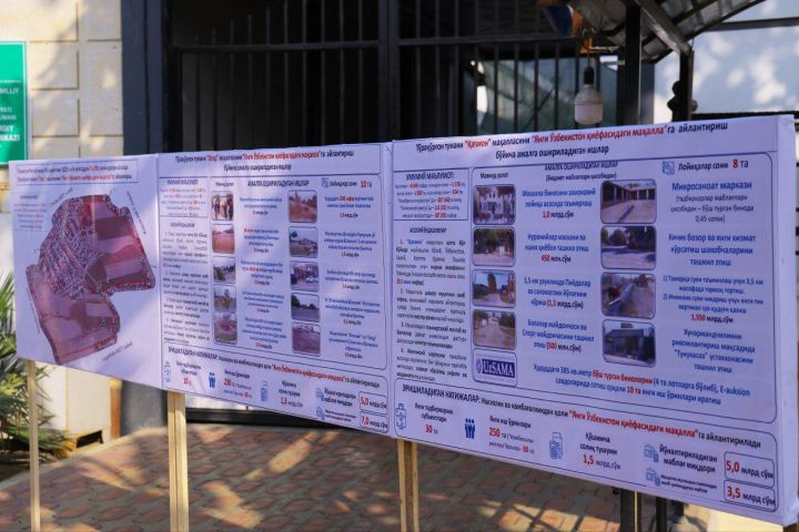 Проект предусматривает капитальный ремонт зданий махалли, запуск 30 новых предприятий, создание 250 рабочих мест, а также строительство центра ветеранов, «зеленой аллеи», детских и спортивных площадок, пешеходных и оздоровительных дорожек, небольшого рынка, объектов сферы услуг и мастерских ремесленников. Особое внимание уделяется обеспечению жителей чистой питьевой водой и орошению приусадебных участков.